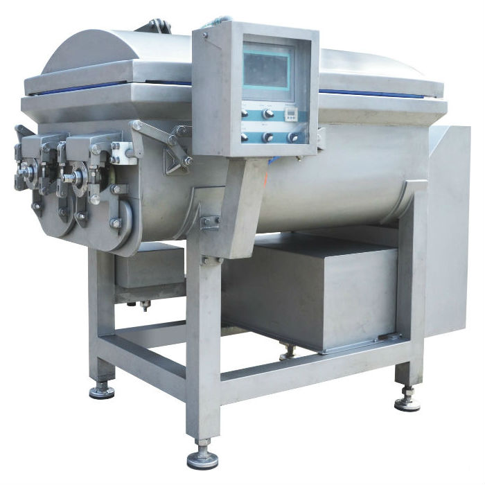真空攪拌機是在原普通攪拌機的基礎上引進國際技術水平而改進的新型攪拌機。在真空的狀態下,物料被負壓后膨脹同時被槳葉進行徑向翻滾、軸向回流,完成混合均勻的攪拌功能,達到理想的攪拌效果,同時采用獨特的攪拌器,使拌出的肉餡纖維細化,并使肉纖維間的動物蛋白能游離析出,以保證肉餡拌和均勻并使之呈現蓬松狀態,加入的調味汁液能充分吸收飽和,以保持餡料的松、鮮、嫩、口感味道優異的特點。同時也是各類速凍水餃、包子、混沌等面食加工廠的理想設備。