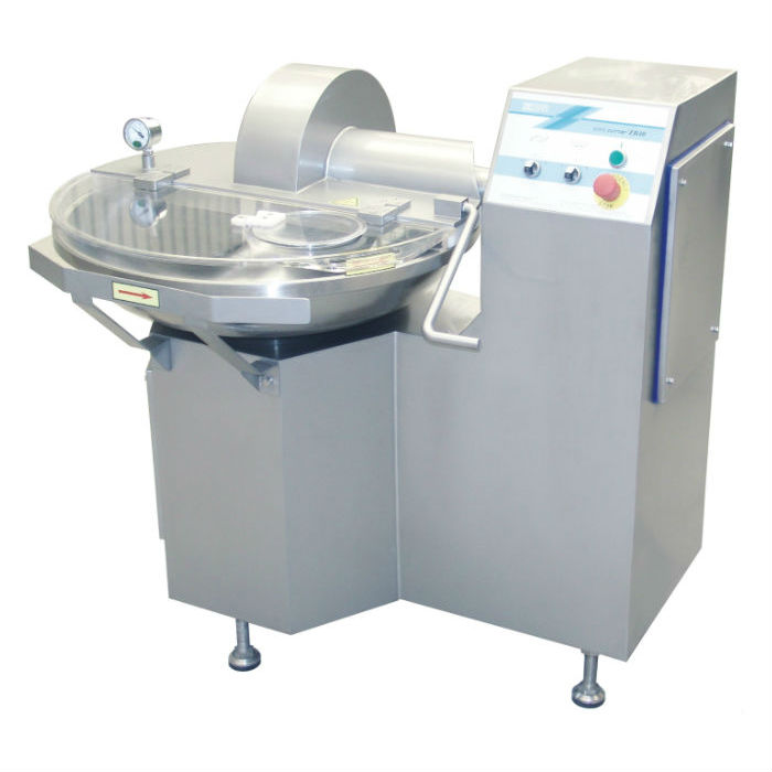 斬鍋由電機通過減速機低速旋轉,不斷向刀組送料。刀軸由雙速電機(或變頻電機)經皮帶帶動高速旋轉。原料在斬鍋中作螺旋式運動的同時,被刀組攪拌和切碎并排除肉糜中的空氣,由于切刀的高速斬切,減少了產品的液汁分離率,保證了乳化效果,增強了產品的彈性和細膩度。
