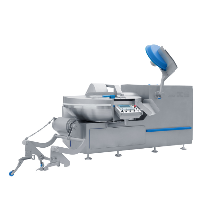 8、 鍋蓋分前后蓋,采用液壓控制,前蓋附有透明加料口,可觀察斬切程度,同時,在斬切時還可將添加劑、水等其他原料添加進去,一起攪拌成均勻的乳狀物;后蓋采用彈性密封裝置,密封效果更好,后蓋帶有保護開關,安全性好。