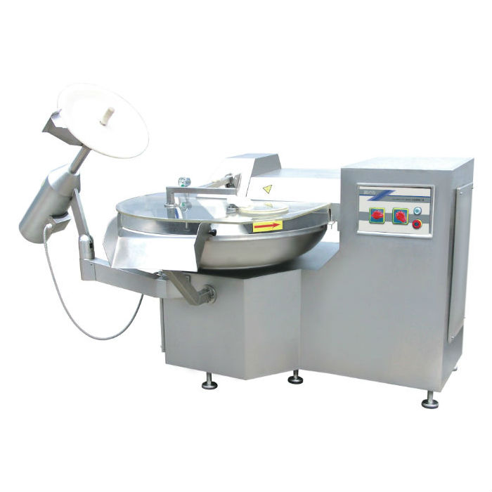 斬鍋由電機(jī)通過減速機(jī)低速旋轉(zhuǎn),不斷向刀組送料。刀軸由雙速電機(jī)(或變頻電機(jī))經(jīng)皮帶帶動高速旋轉(zhuǎn)。原料在斬鍋中作螺旋式運(yùn)動的同時,被刀組攪拌和切碎并排除肉糜中的空氣,由于切刀的高速斬切,減少了產(chǎn)品的液汁分離率,保證了乳化效果,增強(qiáng)了產(chǎn)品的彈性和細(xì)膩度。